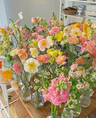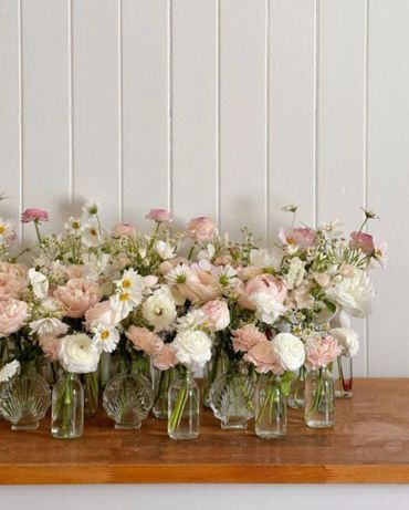 Our bud jars are a mix of clustered florals and single stems (anywhere from 1-6 stems per jar) in our signature style. The mini bud vases differ in vase shape/size, flower variety, color, flower quantity, size + height to each other to create an eclectic mix of beautiful buds!