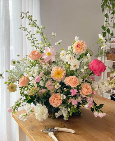 This Offering is Not Fully Customizable, and is mostly Florists choice- We set items based on our most requested and popular items, using flowers that are in-season with our Spring Pastel Color Scheme.